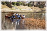 その冷たい池に船があり作業員の人たちが胸の高さまでつかり後片づけの真っ最中でした。きれいなハスを咲かせる為に、こんなご苦労があるんですね。ご苦労様です。